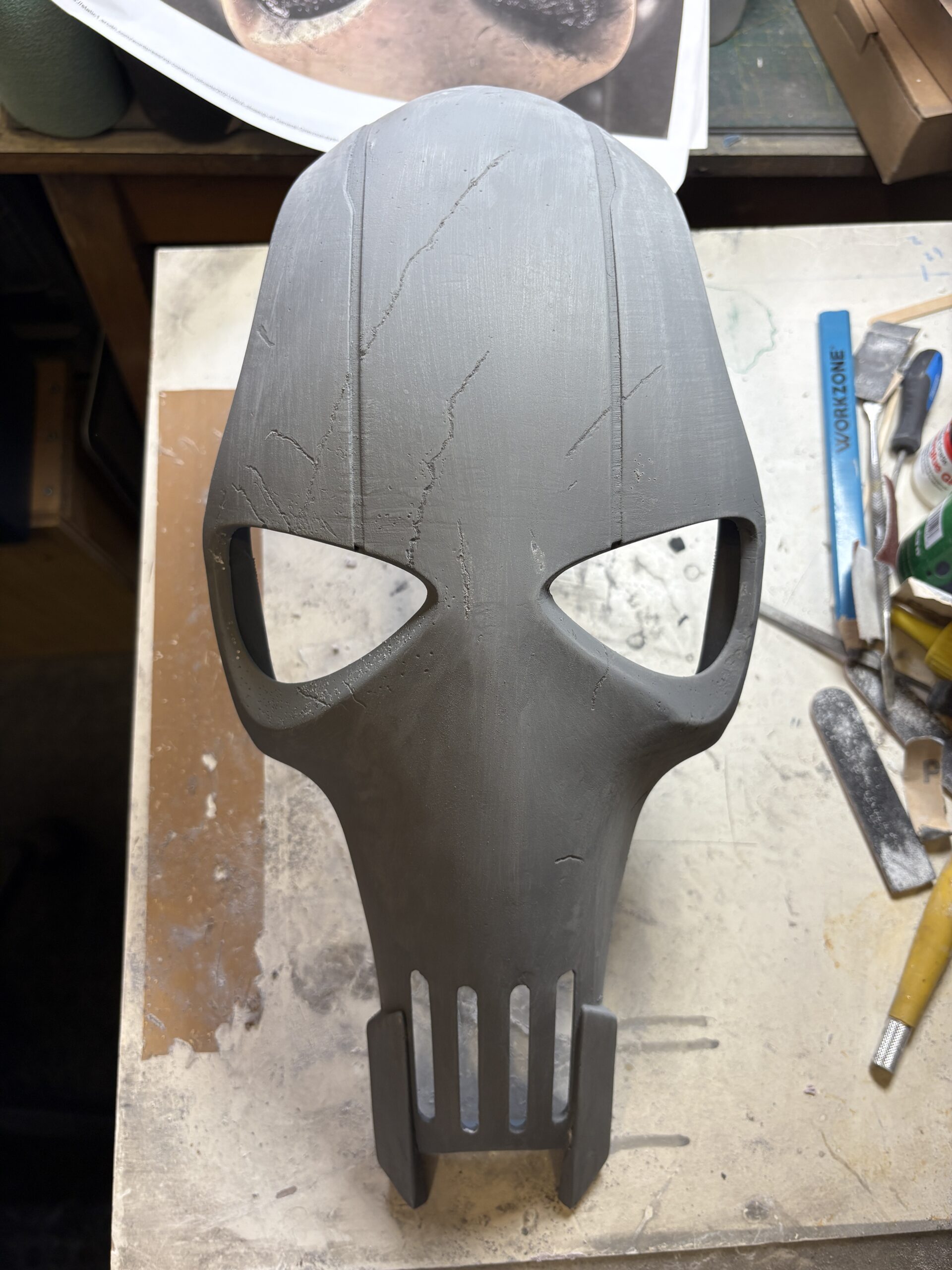 There are some really nice cracks across the head piece which I wanted to ensure I maintained through this process so I could bring them out in the final paint job so point tools were used to dig these after the filler had been smoothed back.